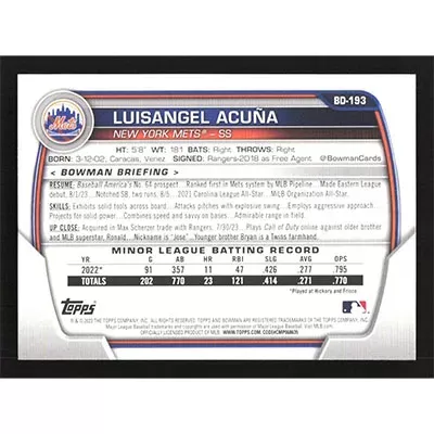 This is a 2023 Bowman Draft Luisangel Acuña baseball card. The card is #BD-193 and pictures show condition.