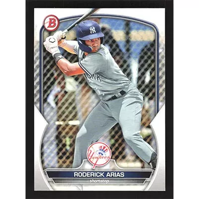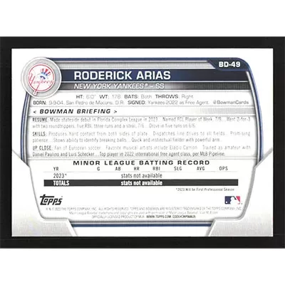 This is a 2023 Bowman Draft Roderick Arias baseball card. The card is #BD-49 and pictures show condition.