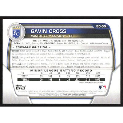 This is a 2023 Bowman Draft Gavin Cross baseball card. The card is #BD-55 and pictures show condition.