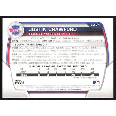This is a 2023 Bowman Draft Justin Crawford baseball card. The card is #BD-71 and pictures show condition.