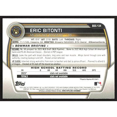 This is a 2023 Bowman Draft Chrome Eric Bitonti baseball card. The card is #BDC-134 and pictures show condition.