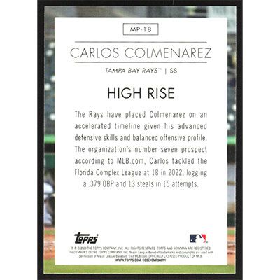This is a 2023 Bowman Modern Prospects Carlos Colmenarez baseball card. The card is #MP-18 and pictures show condition.