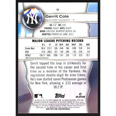 This is a 2023 Bowman Platinum Gerrit Cole baseball card. The card is #39 and pictures show condition.