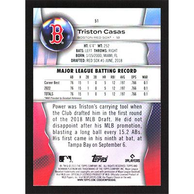 This is a 2023 Bowman Platinum Triston Casas baseball card. The card is #51 and pictures show condition.
