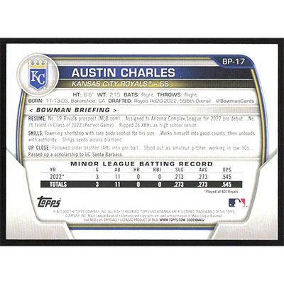 This is a 2023 Bowman Prospects Austin Charles baseball card. The card is #BP-17 and pictures show condition.