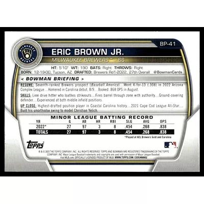 This is a 2023 Bowman Prospects Eric Brown Jr. baseball card. The card is #BP-41 and is in NM-MT condition.