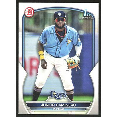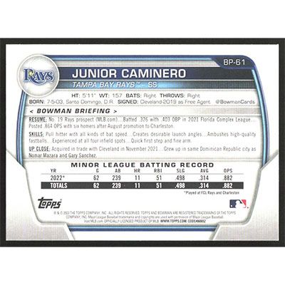 This is a 2023 Bowman Prospects Junior Caminero baseball card. The card is #BP-61 and pictures show condition.