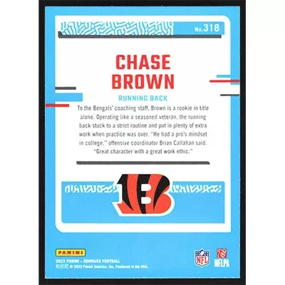 This is a 2023 Donruss Chase Brown Rated Rookie football card. The card is #318 and pictures show condition. Team(s): Cincinnati Bengals Rookie Card (RC)