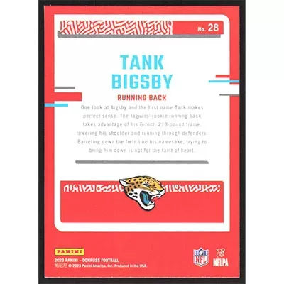 This is a 2023 Donruss The Rookies Tank Bigsby football card. The card is #28 and pictures show condition.