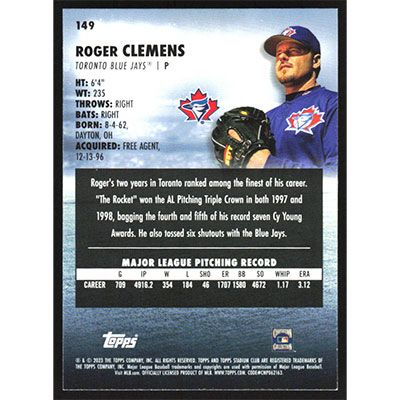 This is a 2023 Stadium Club Roger Clemens baseball card. The card is #149 and pictures show condition.