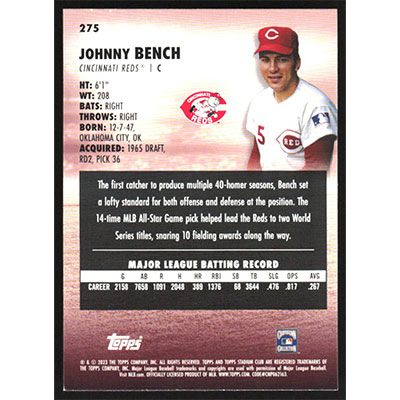 This is a 2023 Stadium Club Johnny Bench baseball card. The card is #275 and pictures show condition.