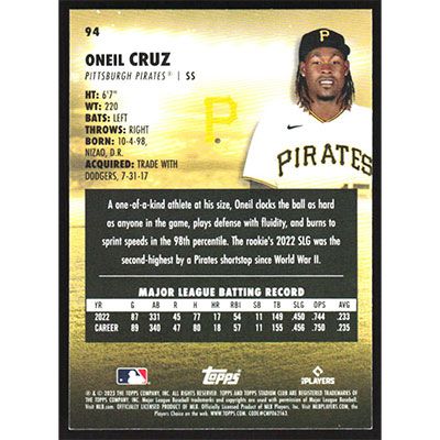 This is a 2023 Stadium Club Oneil Cruz baseball card. The card is #94 and pictures show condition.
