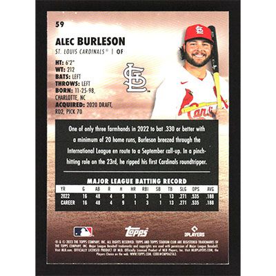 This is a 2023 Stadium Club Members Only Alec Burleson baseball card. The card is #59 and pictures show condition. Team(s): St. Louis Cardinals Rookie Card (RC)
