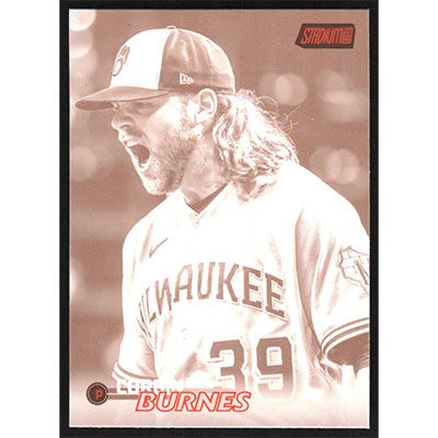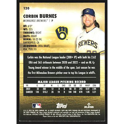 This is a 2023 Stadium Club Sepia Corbin Burnes baseball card. The card is #120 and pictures show condition.