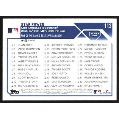This is a 2023 Topps Freddie Freeman, Max Muncy, Gavin Lux, Cody Bellinger and Mookie Betts Checklist Star Power baseball card. The card is #113 and pictures show condition.