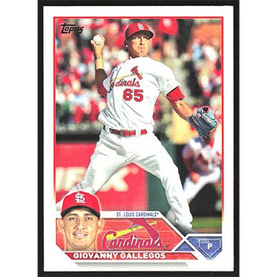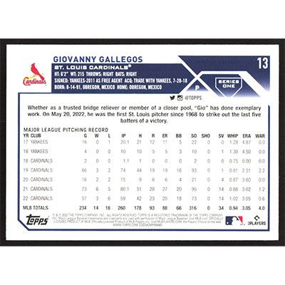 This is a 2023 Topps Giovanny Gallegos baseball card. The card is #13 and pictures show condition.