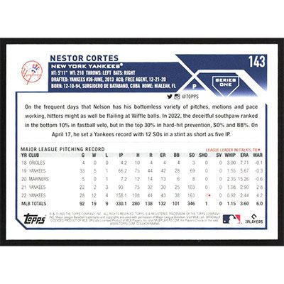 This is a 2023 Topps Nestor Cortes baseball card. The card is #143 and pictures show condition.