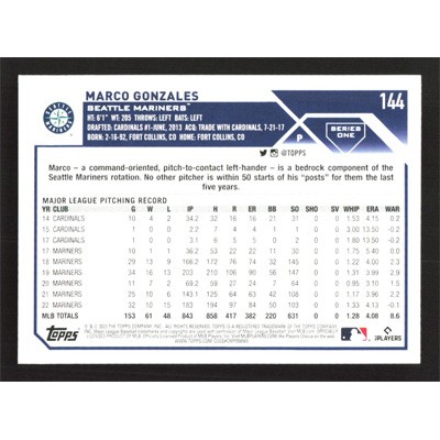 This is a 2023 Topps Marco Gonzales baseball card. The card is #144 and pictures show condition.