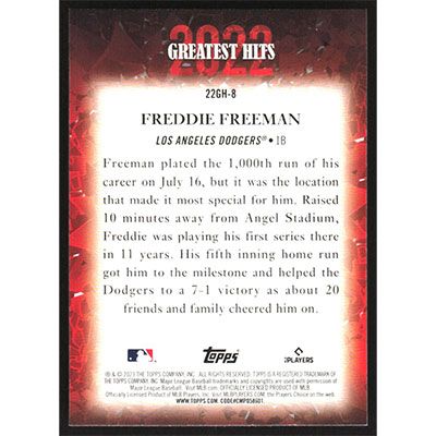 This is a 2023 Topps '22 Greatest Hits Freddie Freeman baseball card. The card is #22GH-8 and pictures show condition.
