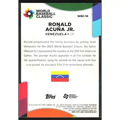 This is a 2023 Topps '23 World Baseball Classic Stars Ronald Acuña Jr. baseball card. The card is #WBC-16 and pictures show condition. Team(s): Atlanta Braves
