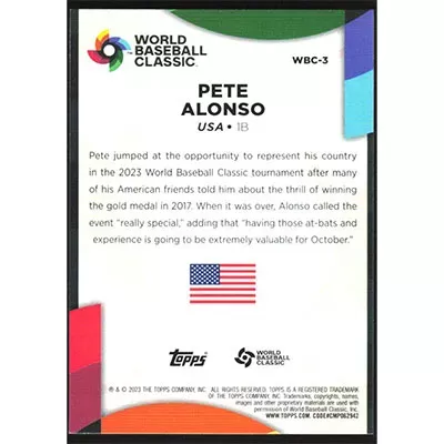 This is a 2023 Topps '23 World Baseball Classic Stars Pete Alonso baseball card. The card is #WBC-3 and pictures show condition.