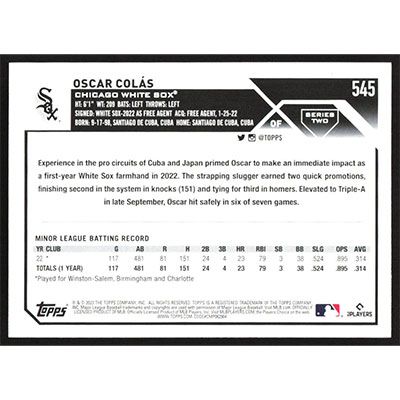 This is a 2023 Topps Oscar Colas baseball card. The card is #545 and pictures show condition.