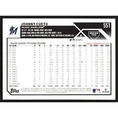 This is a 2023 Topps Johnny Cueto baseball card. The card is #551 and pictures show condition.