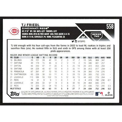 This is a 2023 Topps TJ Friedl baseball card. The card is #558 and pictures show condition.