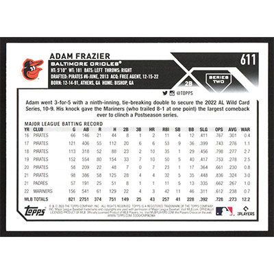 This is a 2023 Topps Adam Frazier baseball card. The card is #611 and pictures show condition.