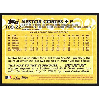 This is a 2023 Topps '88 Nestor Cortes baseball card. The card is #T88-22 and pictures show condition.
