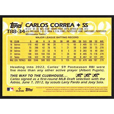 This is a 2023 Topps '88 Carlos Correa baseball card. The card is #T88-34 and pictures show condition.