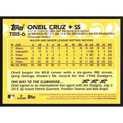 This is a 2023 Topps '88 Oneil Cruz baseball card. The card is #T88-6 and pictures show condition.