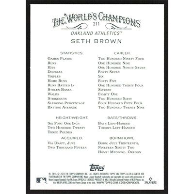 This is a 2023 Topps Allen & Ginter Seth Brown baseball card. The card is #211 and pictures show condition.