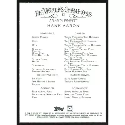 This is a 2023 Topps Allen & Ginter Hank Aaron baseball card. The card is #83 and pictures show condition.