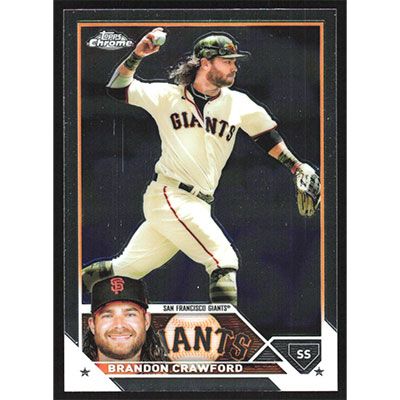 This is a 2023 Topps Chrome Brandon Crawford baseball card. The card is #195 and pictures show condition.
