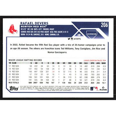 This is a 2023 Topps Chrome Rafael Devers baseball card. The card is #206 and pictures show condition.
