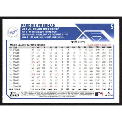 This is a 2023 Topps Chrome Freddie Freeman baseball card. The card is #5 and pictures show condition.