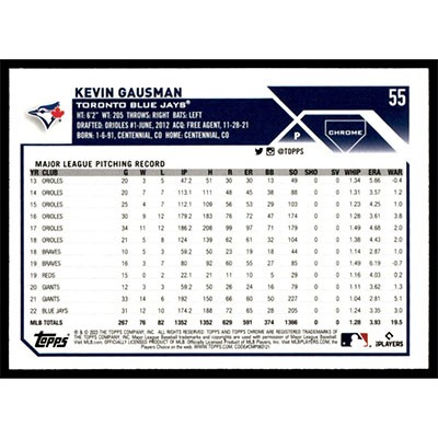 This is a 2023 Topps Chrome Kevin Gausman baseball card. The card is #55 and pictures show condition.