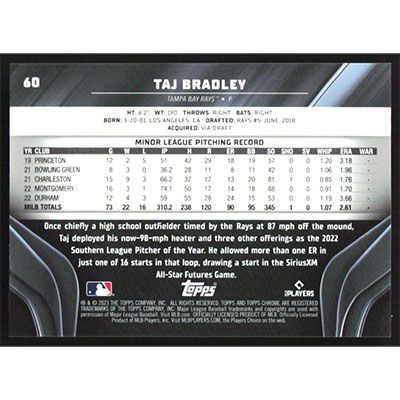 This is a 2023 Topps Chrome Black Green Refractors Taj Bradley baseball card. The card is #60 and pictures show condition. This card is limited; #'d 30/99.
