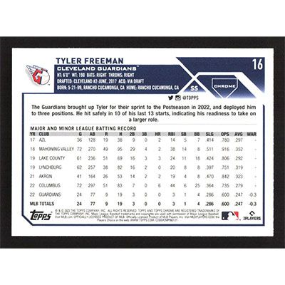 This is a 2023 Topps Chrome Pink Refractors Tyler Freeman baseball card. The card is #16 and pictures show condition. Team(s): Cleveland Guardians Rookie Card (RC)