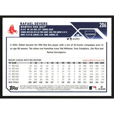 This is a 2023 Topps Chrome Pink Refractors Rafael Devers baseball card. The card is #206 and pictures show condition.