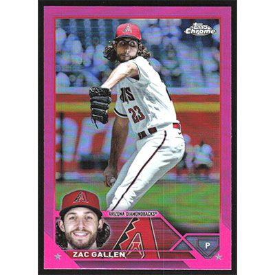 This is a 2023 Topps Chrome Pink Refractors Zac Gallen baseball card. The card is #49 and pictures show condition.