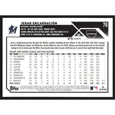 This is a 2023 Topps Chrome Pink Refractors Jerar Encarnacion baseball card. The card is #78 and pictures show condition. Team(s): Miami Marlins Rookie Card (RC)