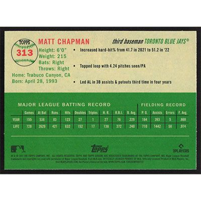 This is a 2023 Topps Chrome Platinum Anniversary Matt Chapman baseball card. The card is #313 and pictures show condition.