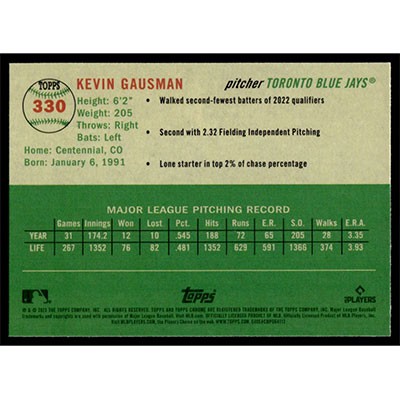 This is a 2023 Topps Chrome Platinum Anniversary Kevin Gausman baseball card. The card is #330 and pictures show condition.