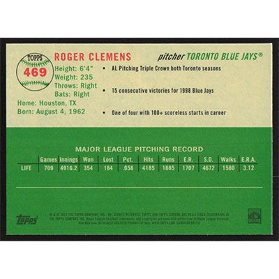 This is a 2023 Topps Chrome Platinum Anniversary Roger Clemens baseball card. The card is #469 and pictures show condition.