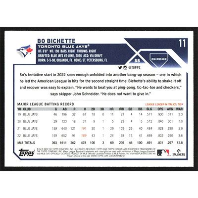 This is a 2023 Topps Chrome Prism Refractors Bo Bichette baseball card. The card is #11 and pictures show condition.