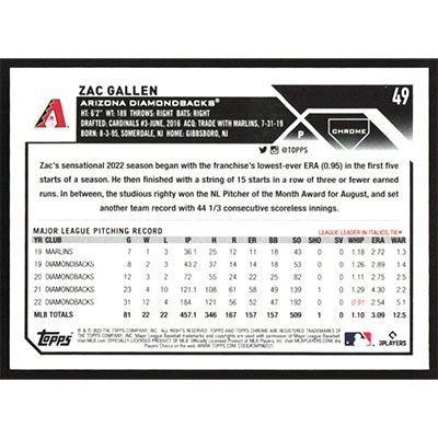 This is a 2023 Topps Chrome Purple Refractors Zac Gallen baseball card. The card is #49 and pictures show condition. This card is limited; #'d 077/250.