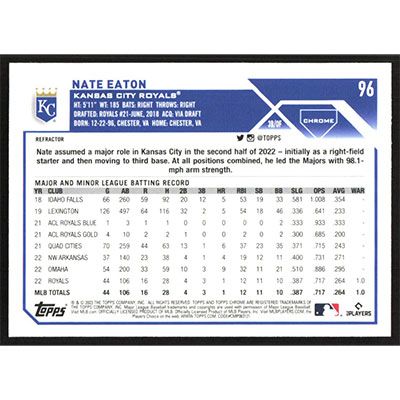 This is a 2023 Topps Chrome Refractors Nate Eaton baseball card. The card is #96 and pictures show condition. Team(s): Kansas City Royals Rookie Card (RC)