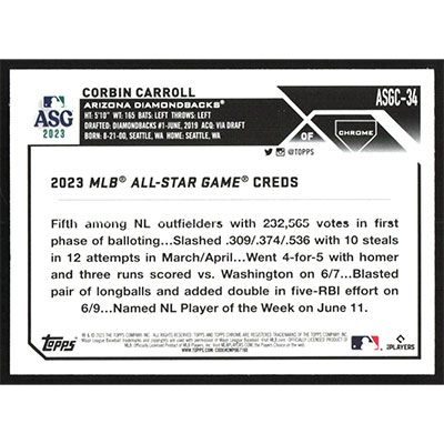 This is a 2023 Topps Chrome Update '23 All-Star Game Corbin Carroll baseball card. The card is #ASGC-34 and pictures show condition. Team(s): Arizona Diamondbacks Rookie Card (RC)